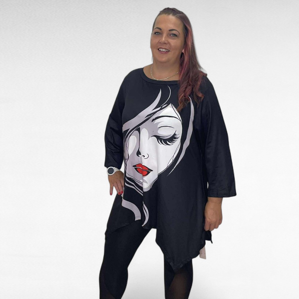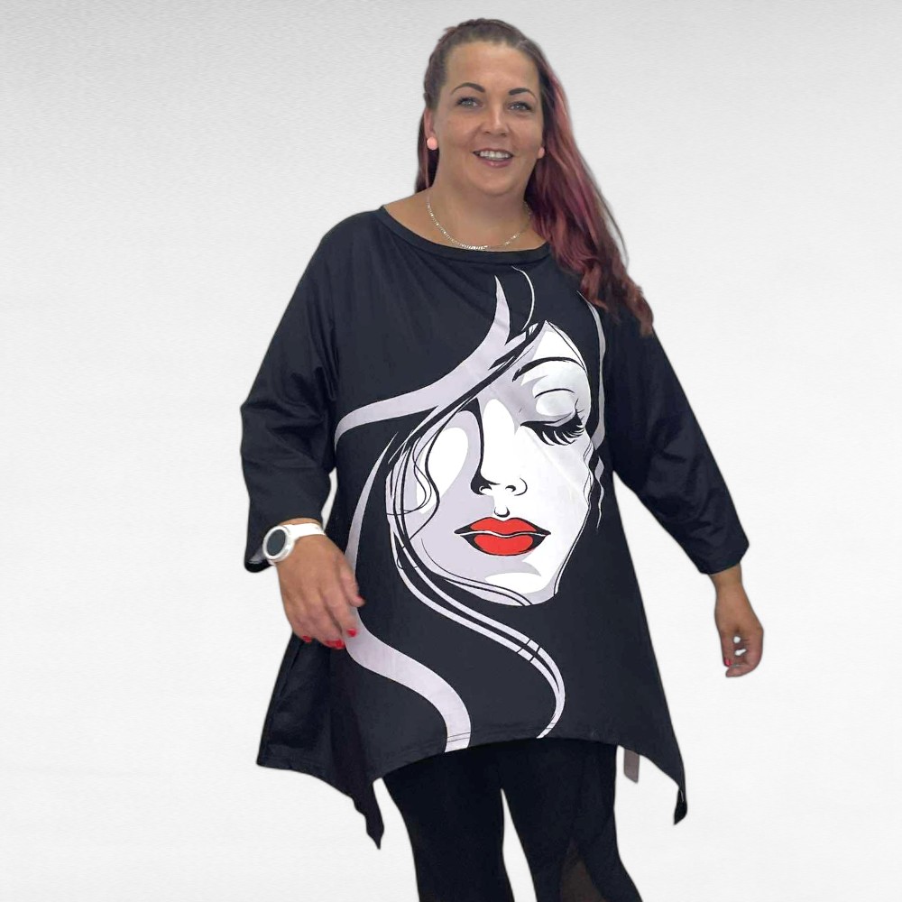 Must efetkse värvilise näomustriga alt kõvastilaieneva lõikega pikkade varrukatega tuunika “Naomi”. Sobib hästi ka kurvikamale puusale. Siidjast hästilangevast materjalist. Sobib kanda nii igapäevaselt kui ka pidulikumal puhul teksade peal.
