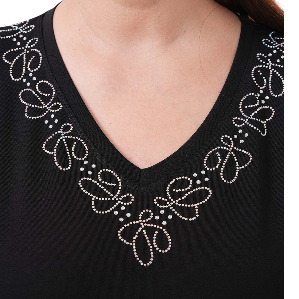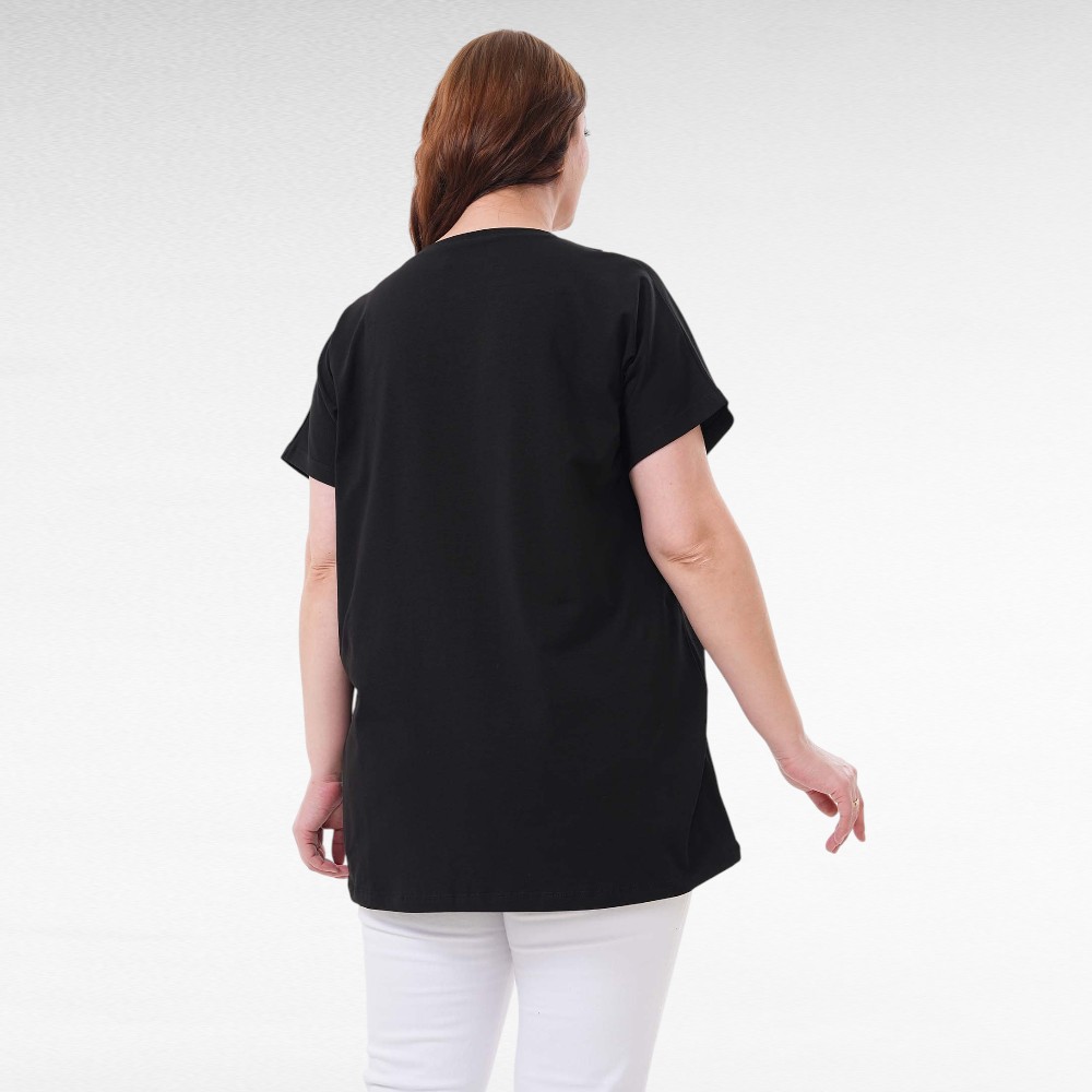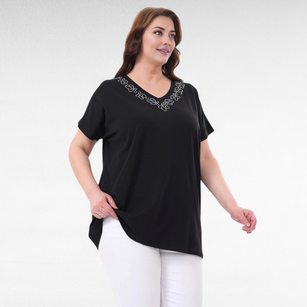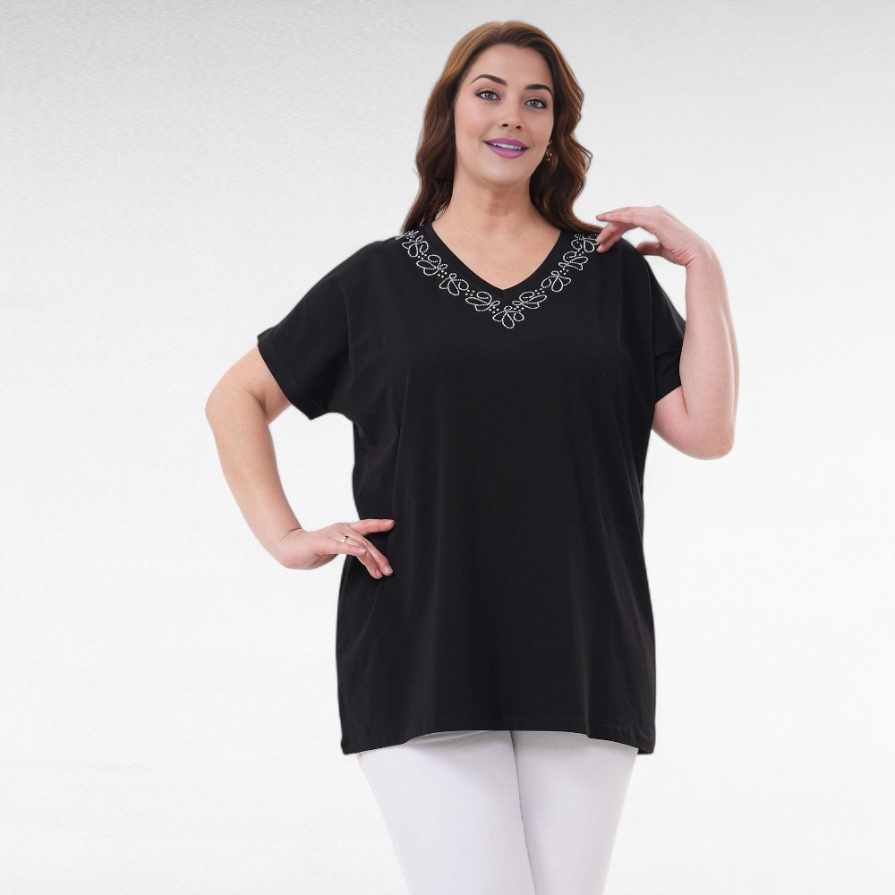 Must pehmest nahasõbralikust puuvillasest kangast kaunite tikanditega ääristatud naiseliku  V-kaelusega pikem pluus/tuunika. Sirge lõige, pikendatud õlaosaga lühikesed varrukad.
