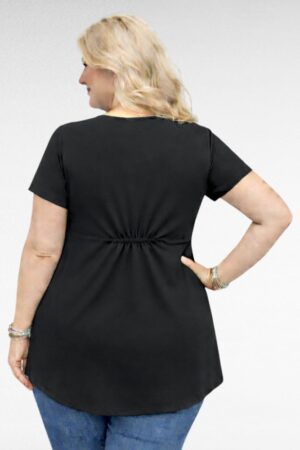 Kaunis eest prinditud roosa- ja valgekirju lillemustriga tagant musta värvi lühikeste varrukatega tuunika Inglismaalt firmalt “Kiabi”. Tagant on umbes 5cm pikem kui eest. Ümar musta värvi soonikkoega ääristatud kaeluseosa. Küljed on eest alt kolmnurgakujuliselt samuti mustad, annab ilusa salendava efekti puusale. Esiosa materjal on siidjas, tagant on pehme veniv musta värvi viskoos.