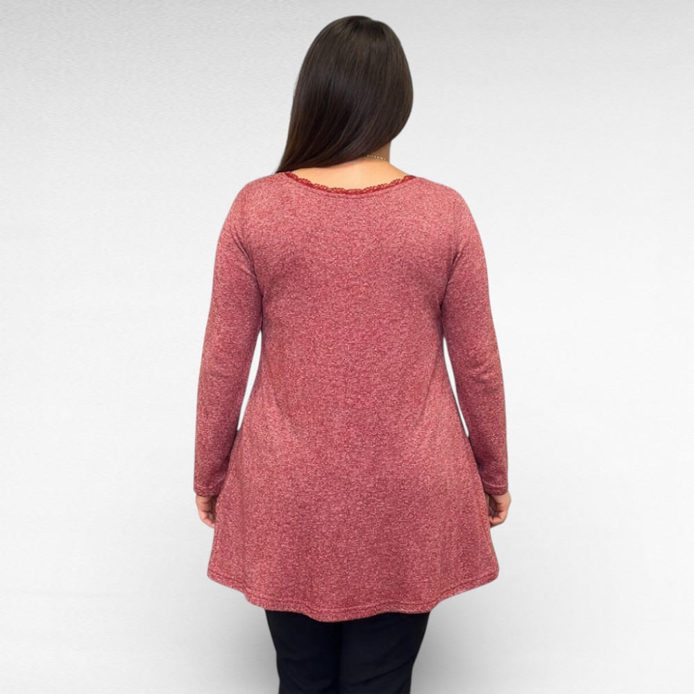 Helepunane sätendav alt laienevate pikkade varrukatega, pitsiga kaunistatud V-kaelusega jõulutuunika firmalt “Cellbes”. Sobib kanda nii igapäevaselt kui ka pidulikul puhul.