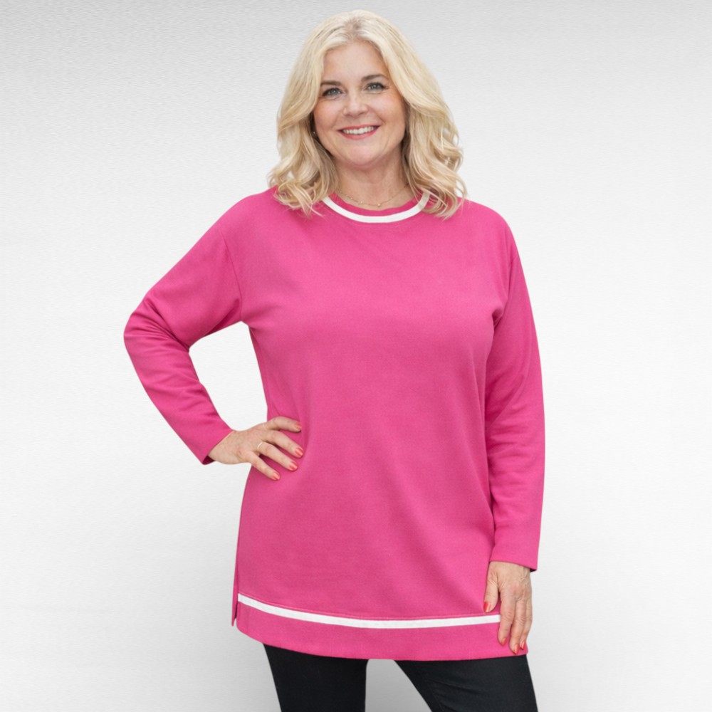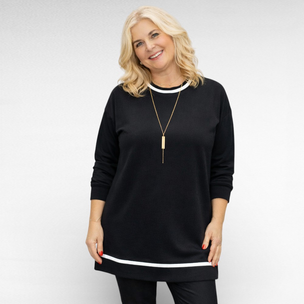 Ümara kaelusega disain ja õlast veidi pikendatud pikad varrukad loovad kauni, voolujoonelise silueti, mis sobib ideaalselt nii igapäevaseks kandmiseks kui ka veidi pidulikumaks hetkeks. Valgete kanditud äärte detailid lisavad mudelile värskust ja iseloomu, jäädes samas maitsekalt tagasihoidlikuks.