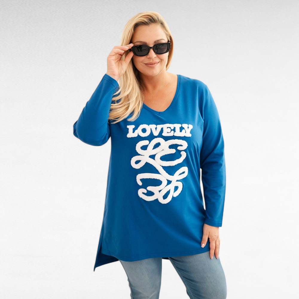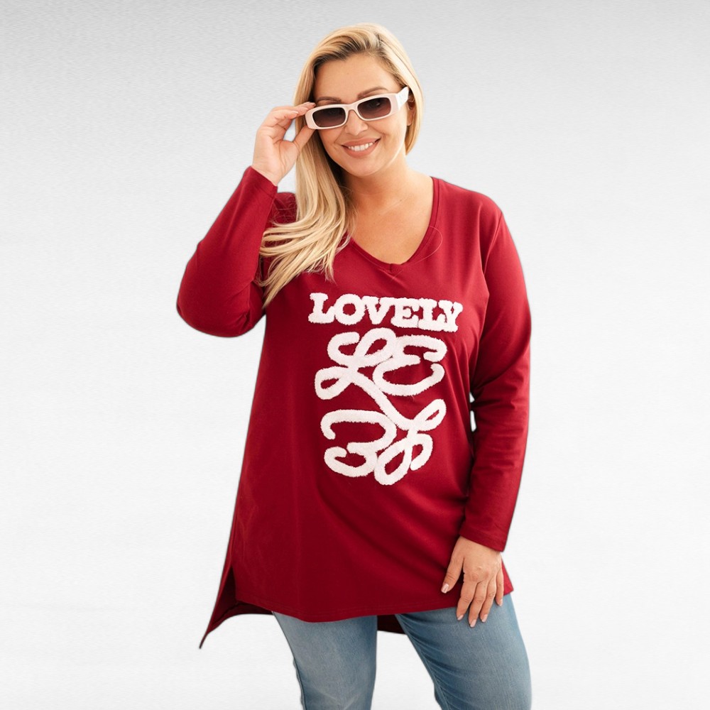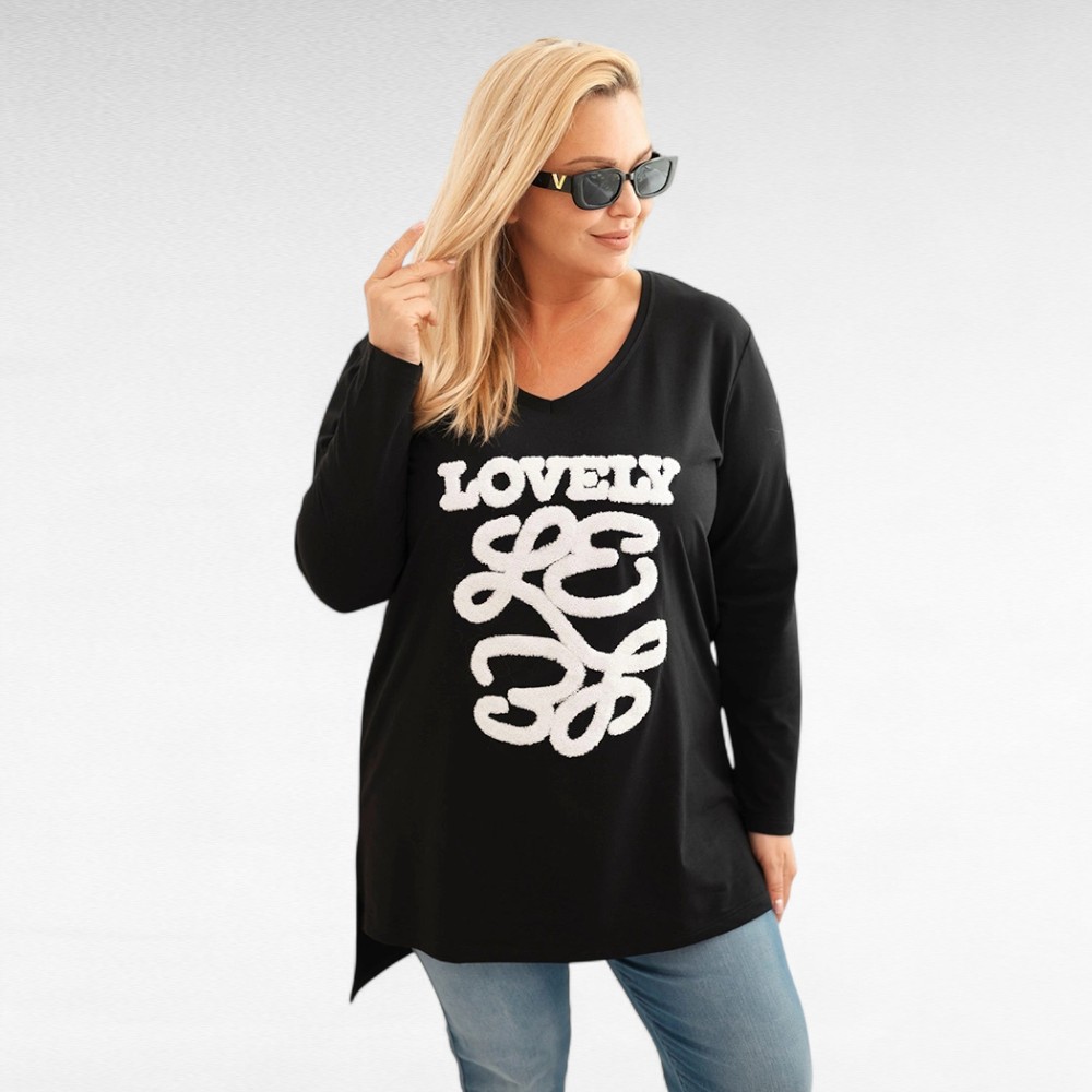 Mugav nahasõbralikust puuvillasegusest kangast V-kaelusega eest  abstraktse mustriga ja “Lovely” kirjaga pikkade varrukatega tuunika. Tagant on pikem kui eest, külgedel lõhikud.  Sobib ideaalselt teksadega.