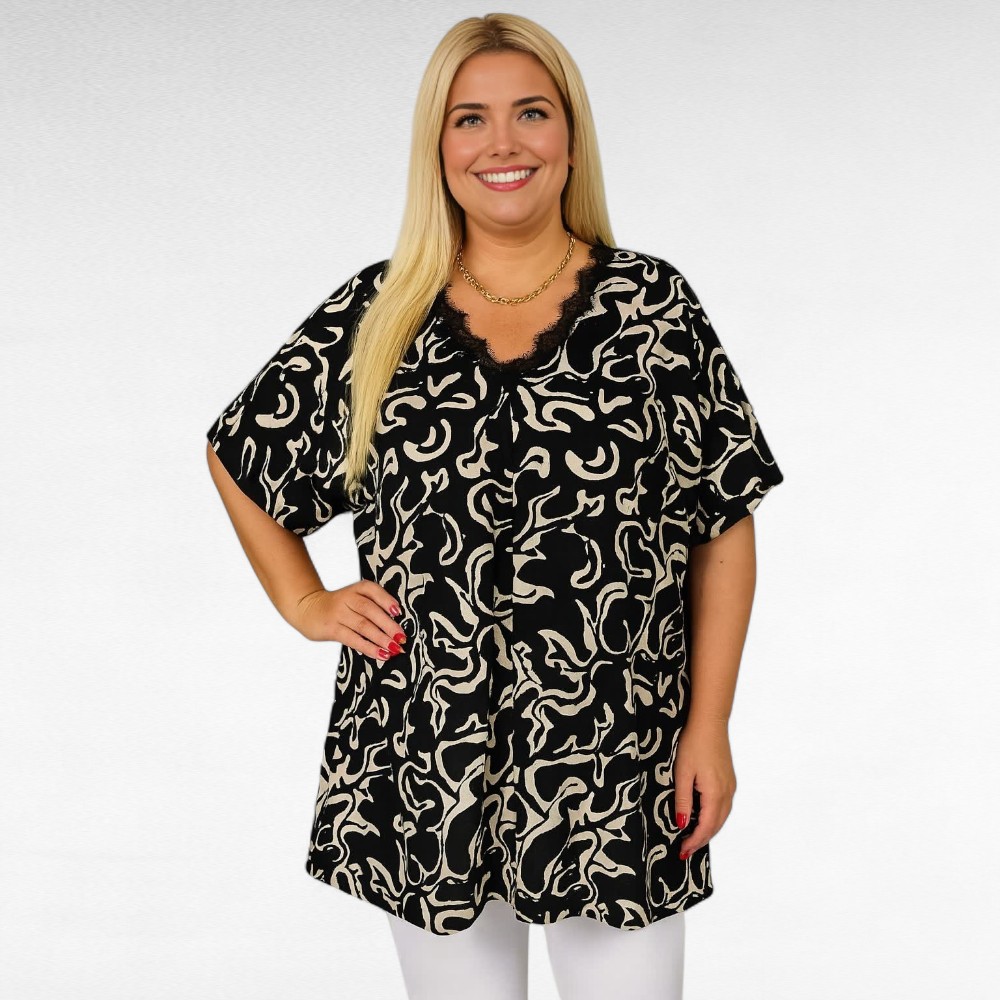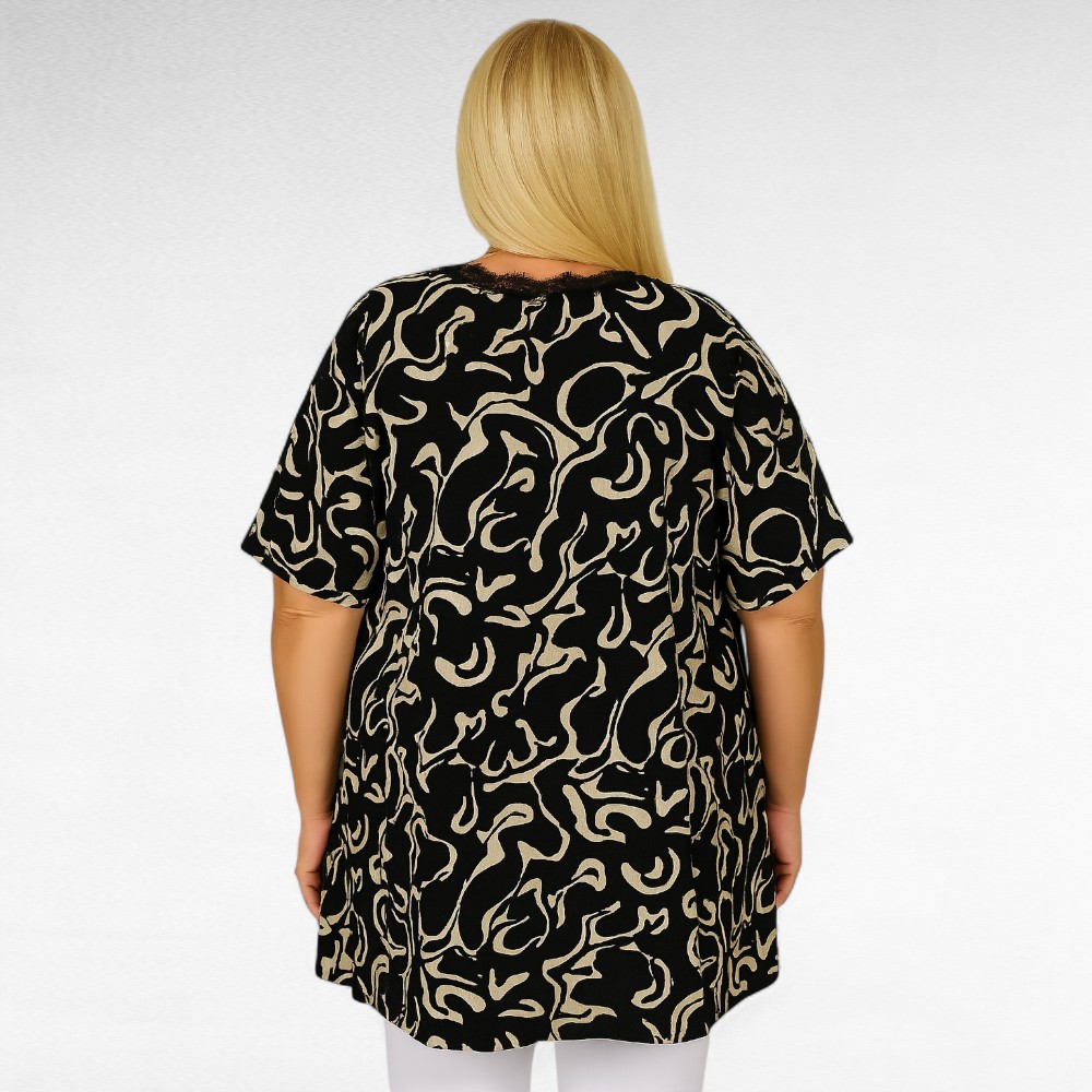 Mugav pehmest venivast materjalist must heleda abstraktse mustriga pitsiga ääristatud V-kaelusega altlaieneva lõikega lühikeste õlast pikendatud avarate varrukatega tuunika “Esmira””. Külgedel väikesed lõhikud.