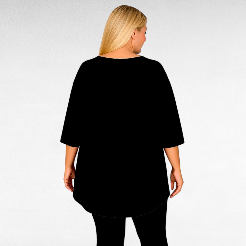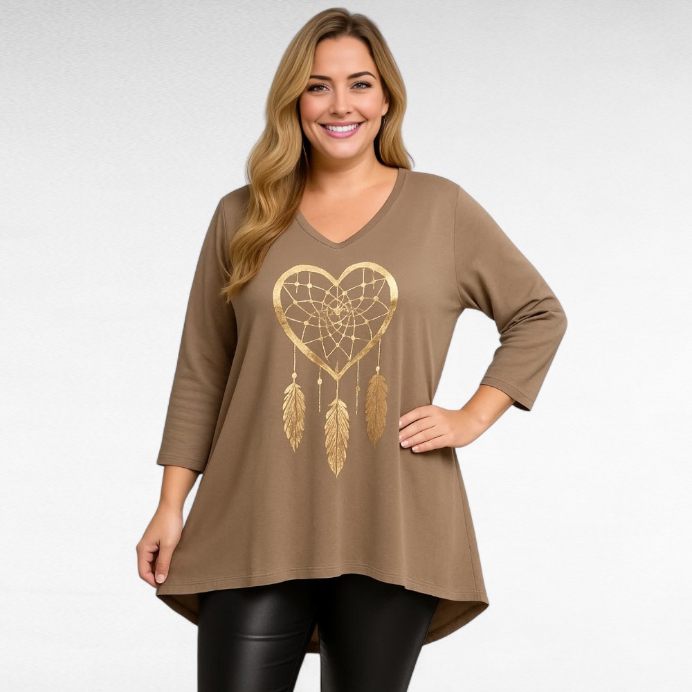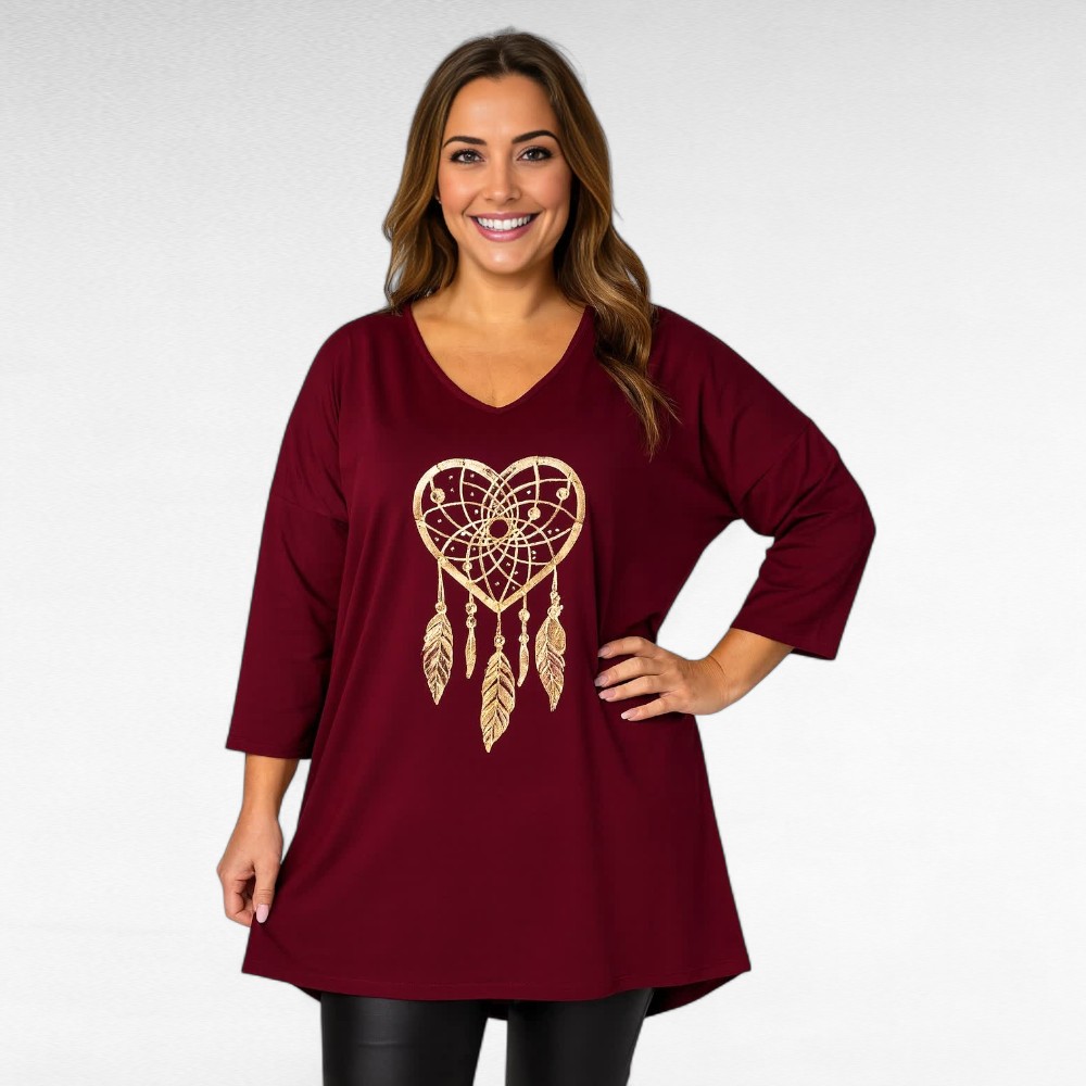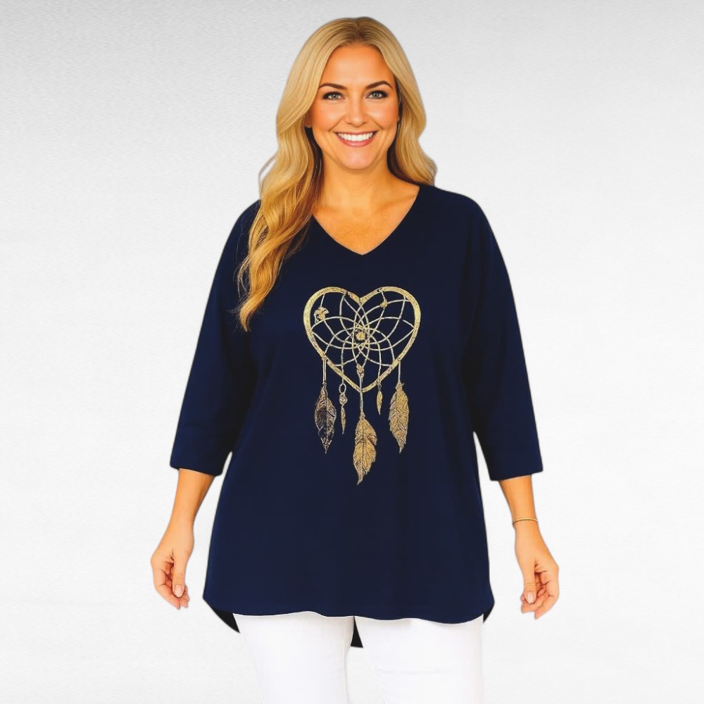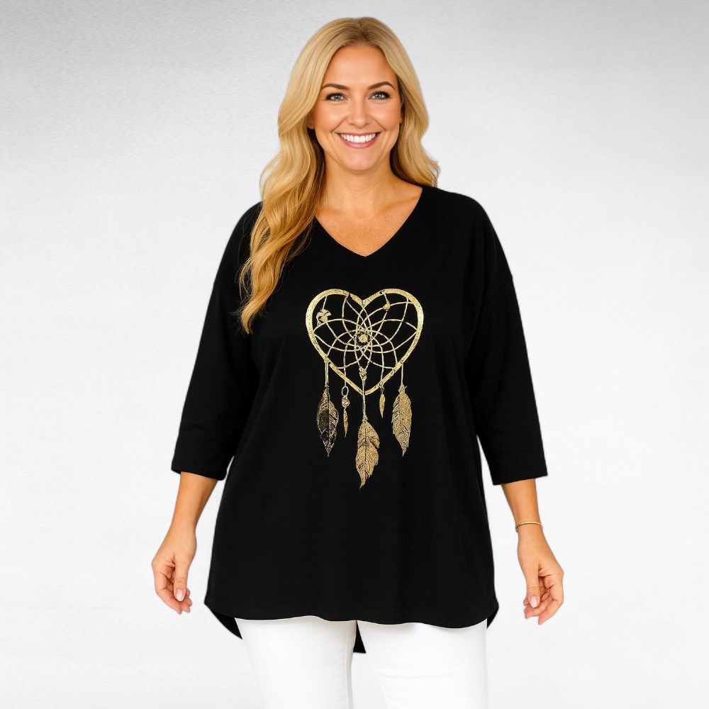 Mugav pehmest veidi venivast puuvillasest kangast sirge lõikega V-kaelusega poolpikkade õlast pikendatud varrukatega unenäopüüdja mustriga tuunika “Betti Fashion”. Tagant on 8cm pikem kui eest, altäär on tagant kaarjas. Väga mõnus sügishooajal teksade peal kanda.