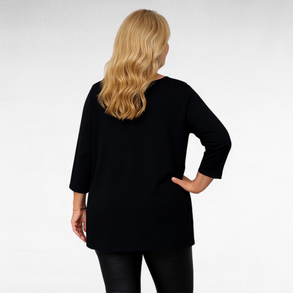 Mugav pehmest venivast materjalist V-kaelusega sirge lõikega must punase-ja roosakirju roosimustriga poolpikkade kimonovarrukatega pluss suuruses  tuunika “Esmira Fashion”. Külgedel väikesed lõhikud. Selja tagant on üleni must.