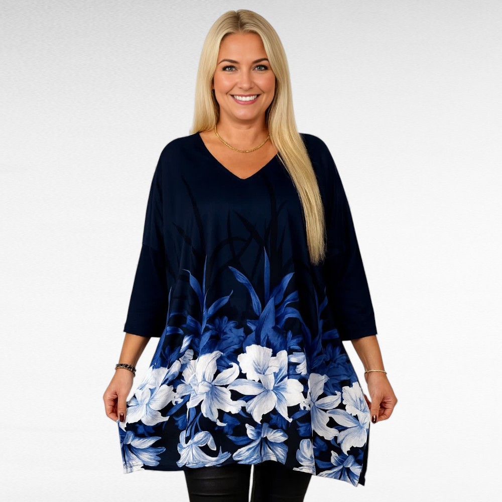 Mugav pehmest venivast materjalist V-kaelusega alt veidi laieneva lõikega must efektse sinise-ja valgekirju lillemustriga poolpikkade kimonovarrukatega pluss suuruses  tuunika “Esmira Fashion”. Külgedel väikesed lõhikud. Selja tagant on üleni must.