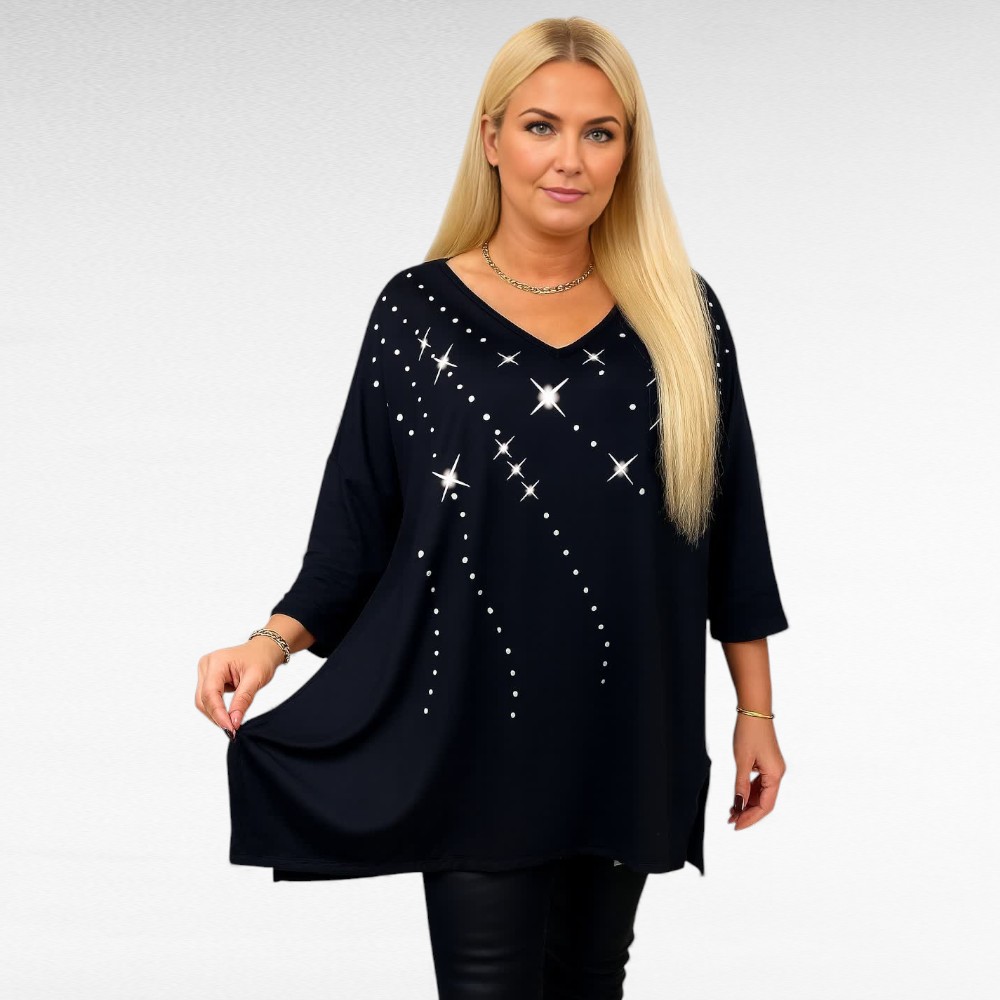 Mugav pehmest venivast materjalist V-kaelusega sirge lõikega must efektse valge prinditud tähemustriga poolpikkade kimonovarrukatega pluss suuruses  tuunika “Esmira Fashion”. Külgedel väikesed lõhikud. Selja tagant on üleni must.