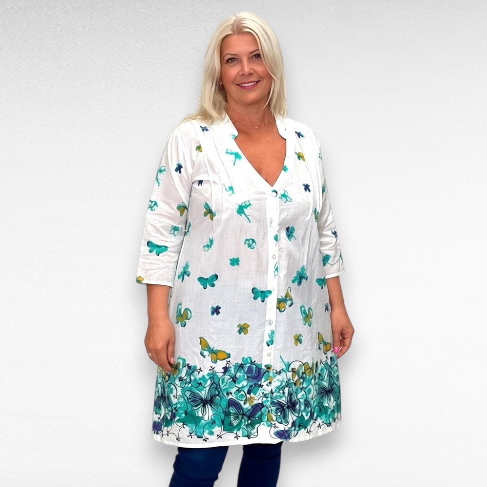 Täispuuvillane V-kaelusega eest nööpidega pikem rohelisekirju liblikamustriga tuunika Inglismaalt firmalt “Viera”. Selja taha seotav vöö. Alt veidi laienev lõige.