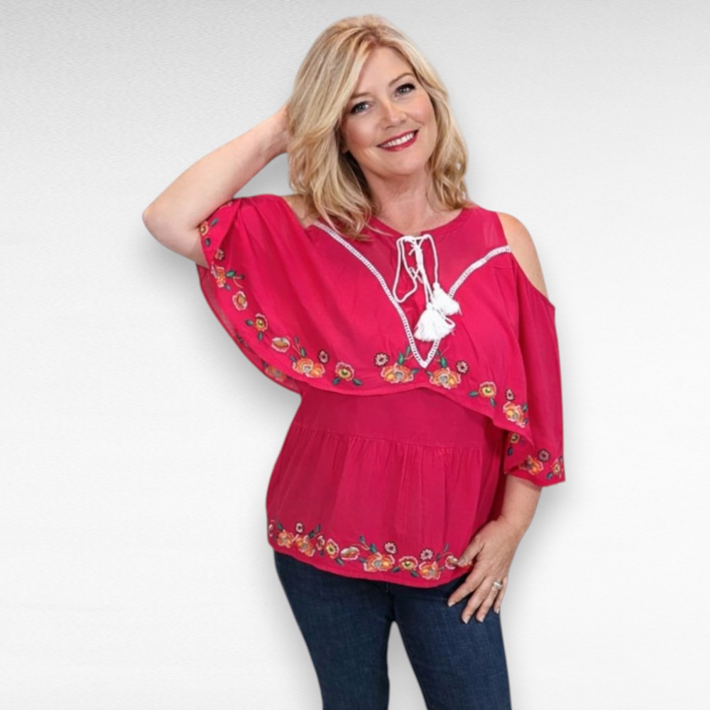 Väga efektse tegumoega tumeroosat tooni pealt keebilaadse õlgu vabaksjätvate varrukatega, mõnusast hingavast puuvillasest kortsuriidesarnasest materjalist, tikanditega kaunistatud, eest valgete seotavate paeltega armas suvepluus Inglismaa firmalt “Simply Be”. Allääres sats.