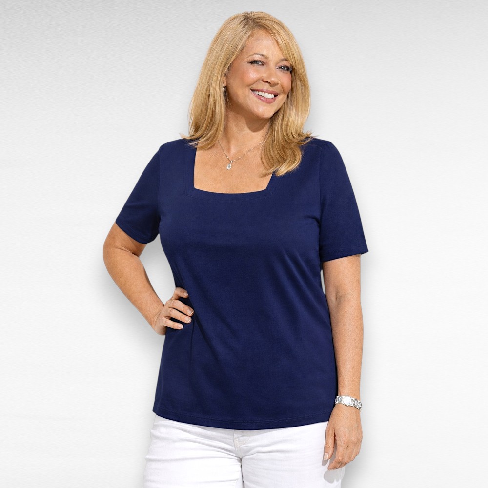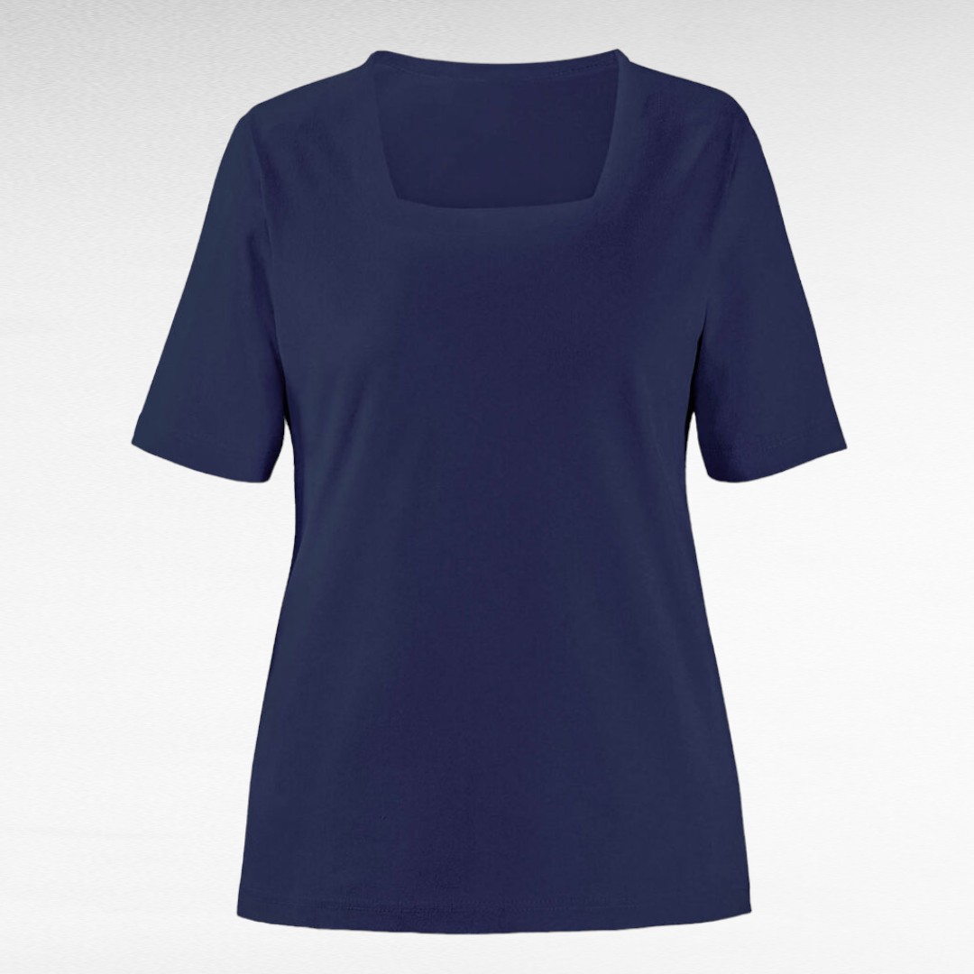 Kauni naiseliku nelinurkse kaelusega puuvillane tumesinine suvine naiste pluus Saksamaalt firmalt “Otto”.