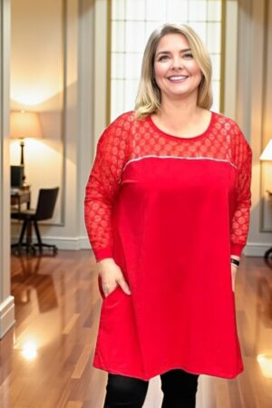 TU.238 – Pidulik punane pitsiline taskutega puuvillane tuunika “Velli”