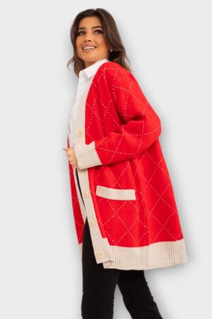 KA.147 – Säbrulise ruudulise mustriga eest nööpidega pikem pehme kardigan