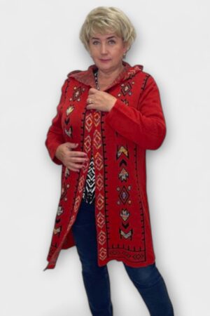 KA.244 – Punane kirju etnomustriga kapuutsiga kardigan