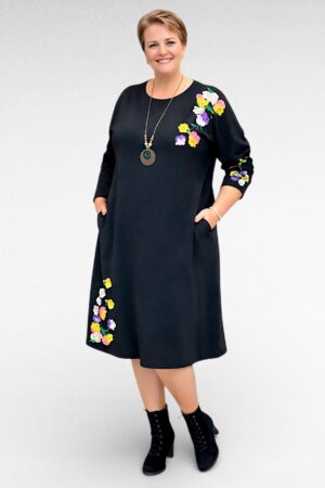 KL.689 – Must kollase- ja lillakirjute lilletikanditega taskutega kleit “Milve”