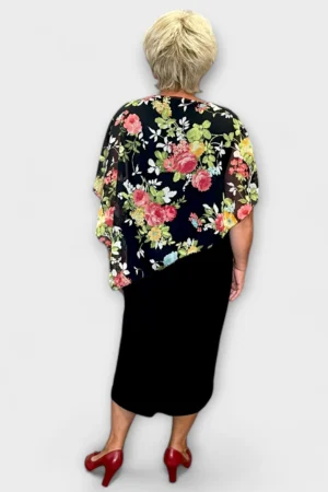 KL.647 – Must väikese roosa- ja valgelillelise mustriga õlasalliga pidulik kleit “Aliis”